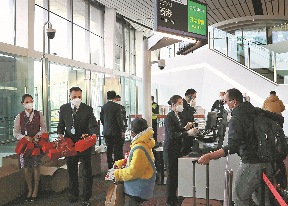 Passengers board China Southern Airlines Flight CZ309 from Beijing Daxing International Airport to Hong Kong, the first cross-border flight departing from the airport in three years. WANG ZHUANGFEI/CHINA DAILY