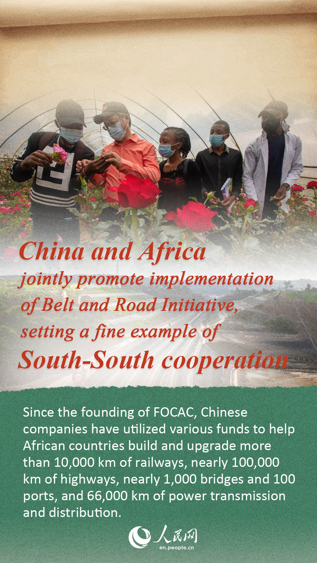 Since the founding of FOCAC, Chinese companies have utilized various funds to help African countries build and upgrade more than 10,000 km of railways, nearly 100,000 km of highways, nearly 1,000 bridges and 100 ports, and 66,000 km of power transmission and distribution. They have also helped build an installed power-generating capacity of 120 million kW, a communications backbone network of 150,000 km and a network service covering nearly 700 million user terminals.