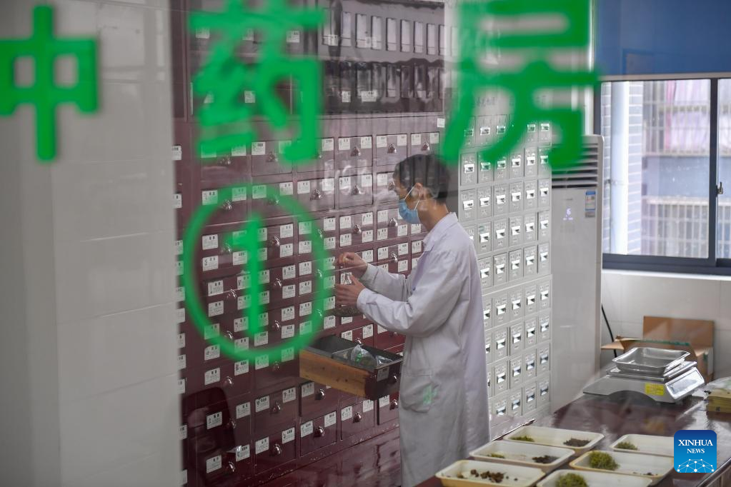 A pharmacist dispenses traditional Chinese medicine (TCM) at a health center in Qiaokou Town, Wangcheng District, Changsha, central China's Hunan Province, Jan. 17, 2023. As the Spring Festival approaches, medical workers from rural health centers of Wangcheng District have provided free traditional Chinese medicine (TCM) care packages and door-to-door services to senior residents and others in need. Wangcheng District has so far delivered more than 21,000 TCM care packages in total to its rural residents. (Xinhua/Chen Zeguo)