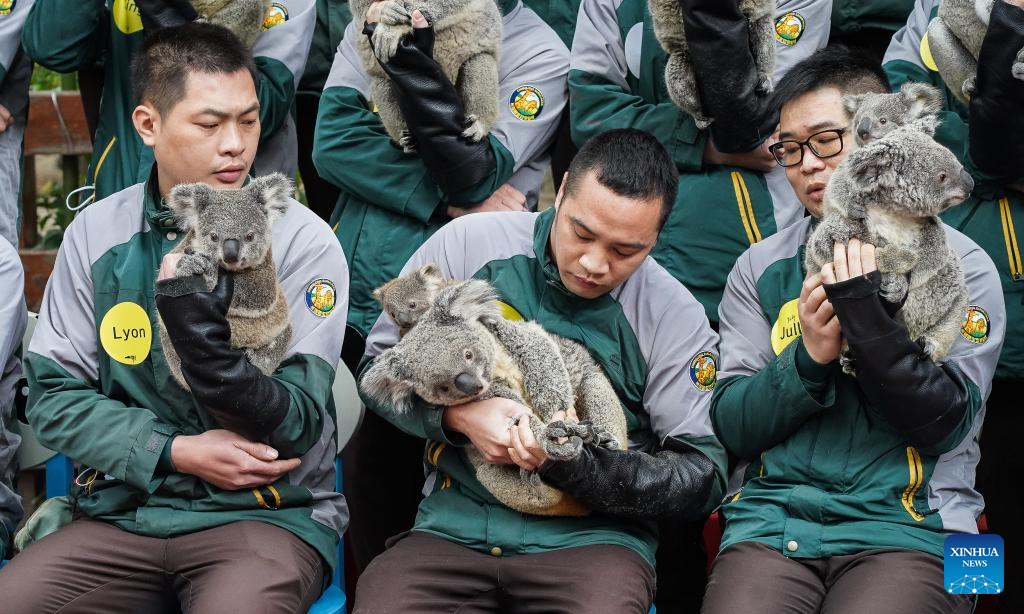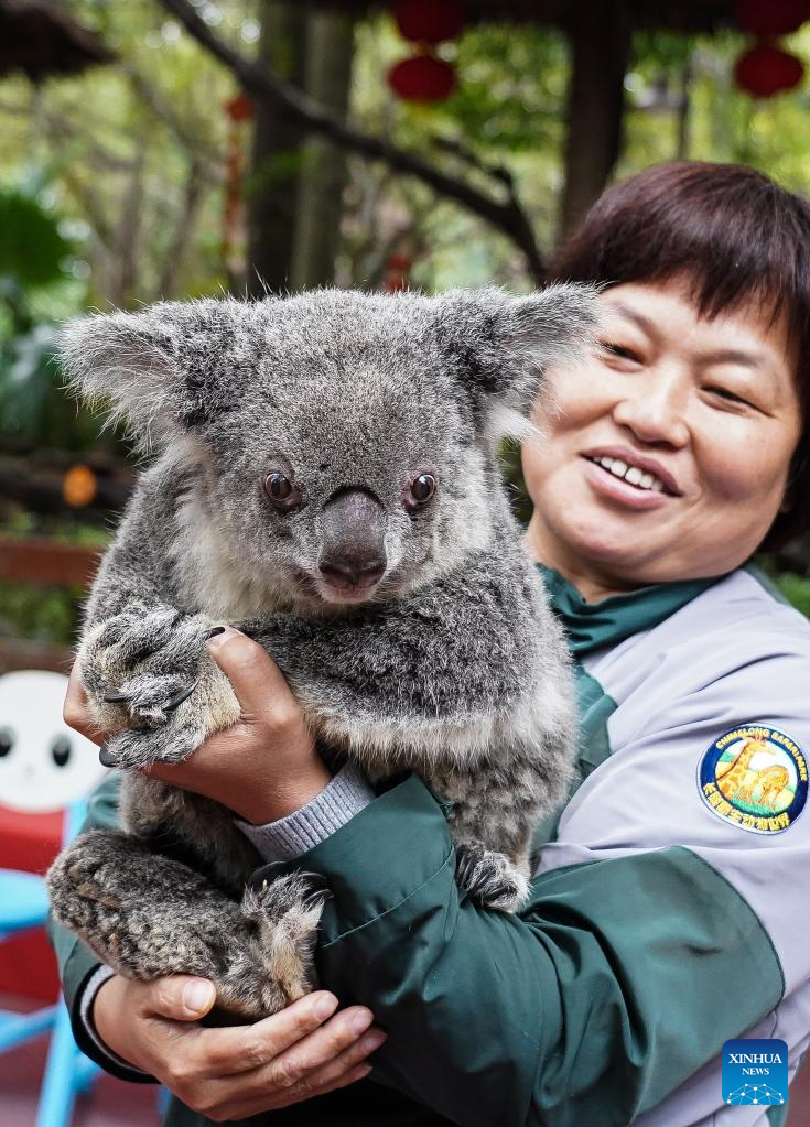 A breeder (C) holds baby koala "Baobao", the newborn seventh generation in a koala family, and its mother at the Chimelong Safari Park in Guangzhou, south China's Guangdong Province, Jan. 17, 2023. The total of 66 koalas from a family in seven generations living at the park made a public appearance to greet their fans before the Spring Festival. (Xinhua/Liu Dawei)
