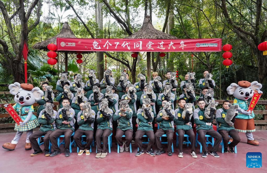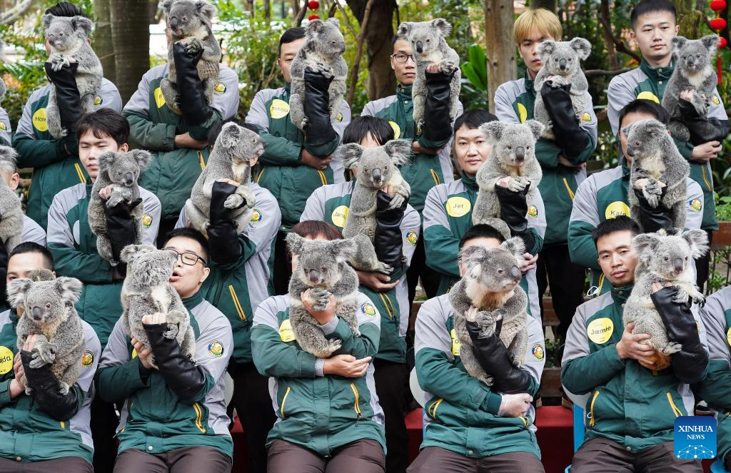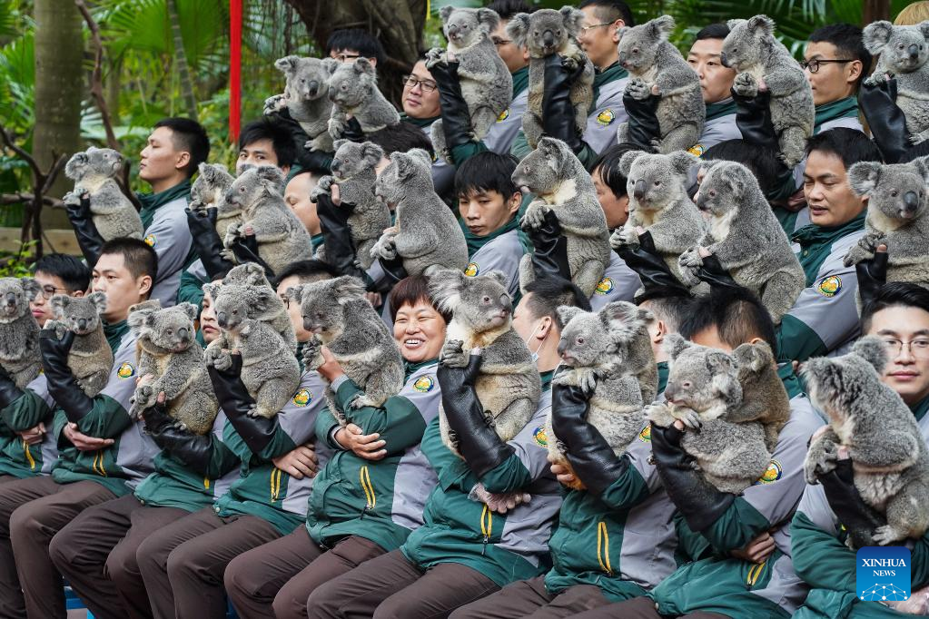 Breeders pose for a group photo with koalas from a family with seven generations at the Chimelong Safari Park in Guangzhou, south China's Guangdong Province, Jan. 17, 2023. The total of 66 koalas from a family in seven generations living at the park made a public appearance to greet their fans before the Spring Festival. (Xinhua/Liu Dawei)