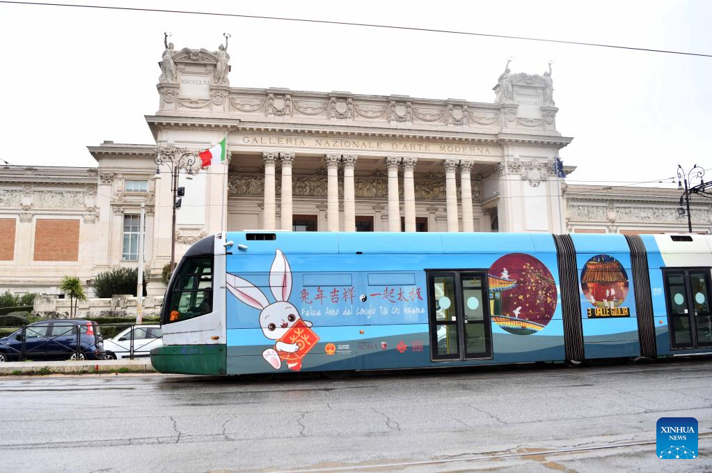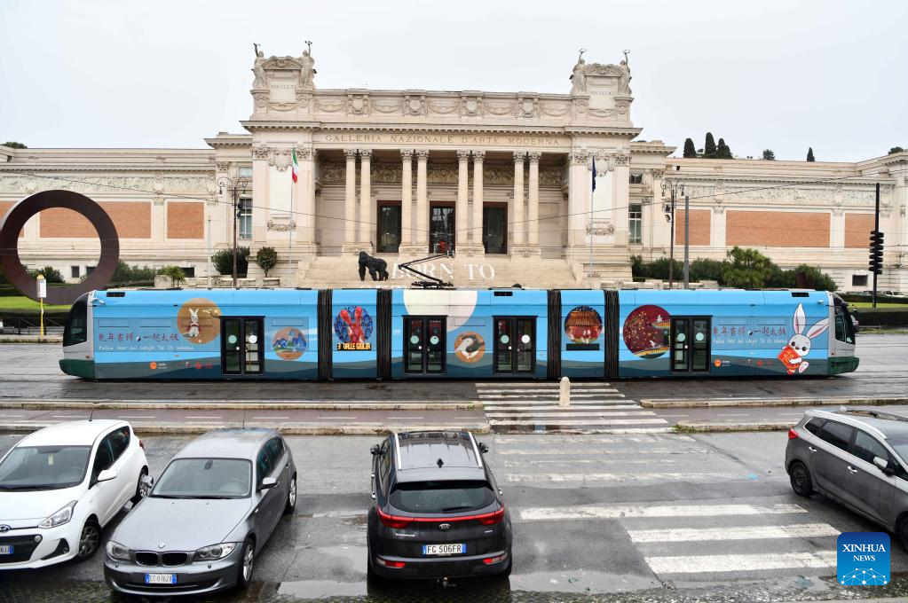 A tram decorated with paintings themed on the Chinese Lunar New Year of the Rabbit drives past the National Gallery of Modern and Contemporary Art in Rome, Italy, Jan. 17, 2023. A tram featuring the Year of the Rabbit was unveiled here on Tuesday to celebrate the upcoming Chinese Lunar New Year. (Xinhua/Jin Mamengni)