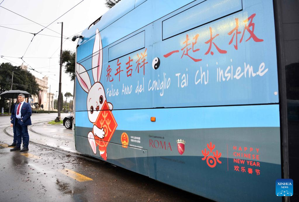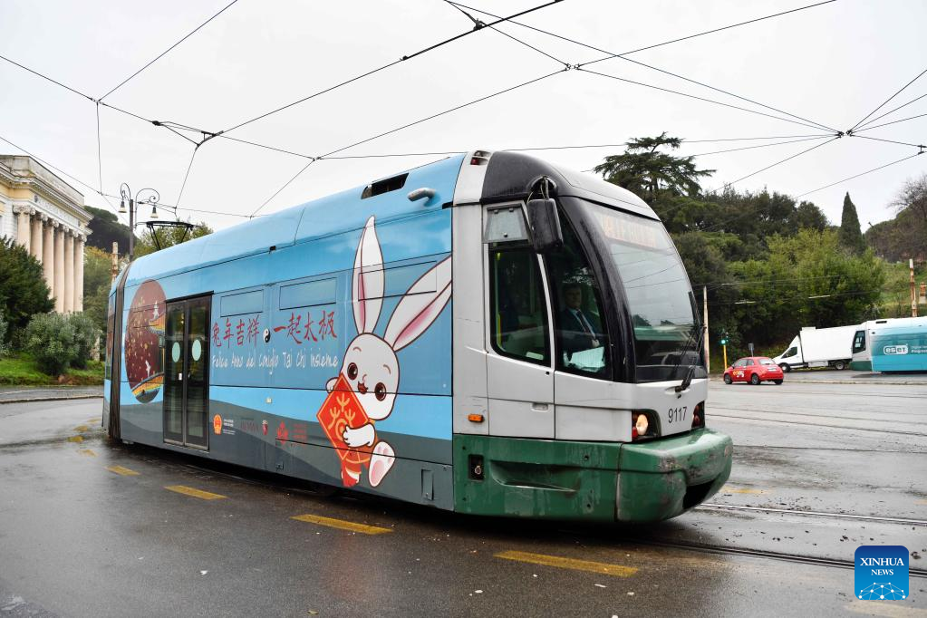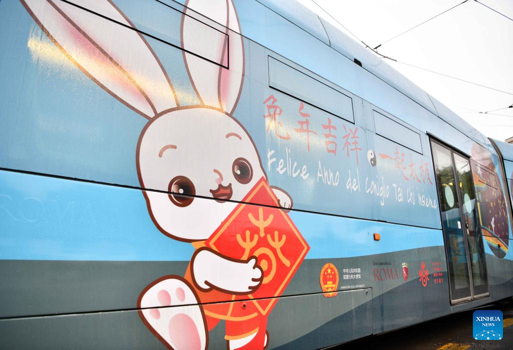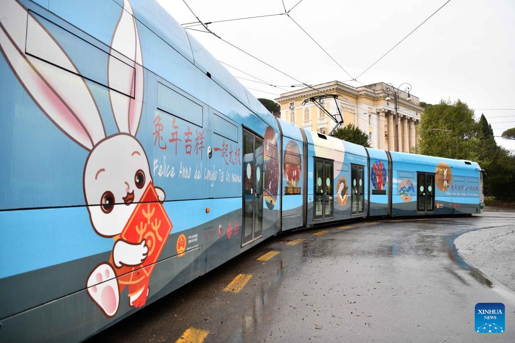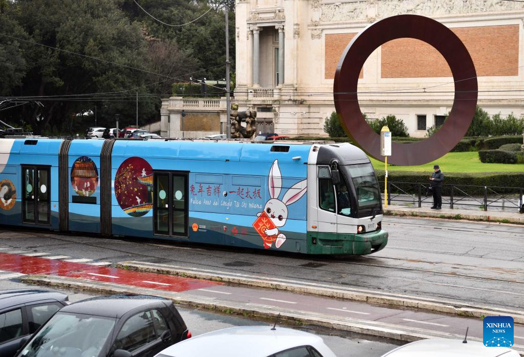 A tram decorated with paintings themed on the Chinese Lunar New Year of the Rabbit is seen in Rome, Italy, Jan. 17, 2023. A tram featuring the Year of the Rabbit was unveiled here on Tuesday to celebrate the upcoming Chinese Lunar New Year. (Xinhua/Jin Mamengni)