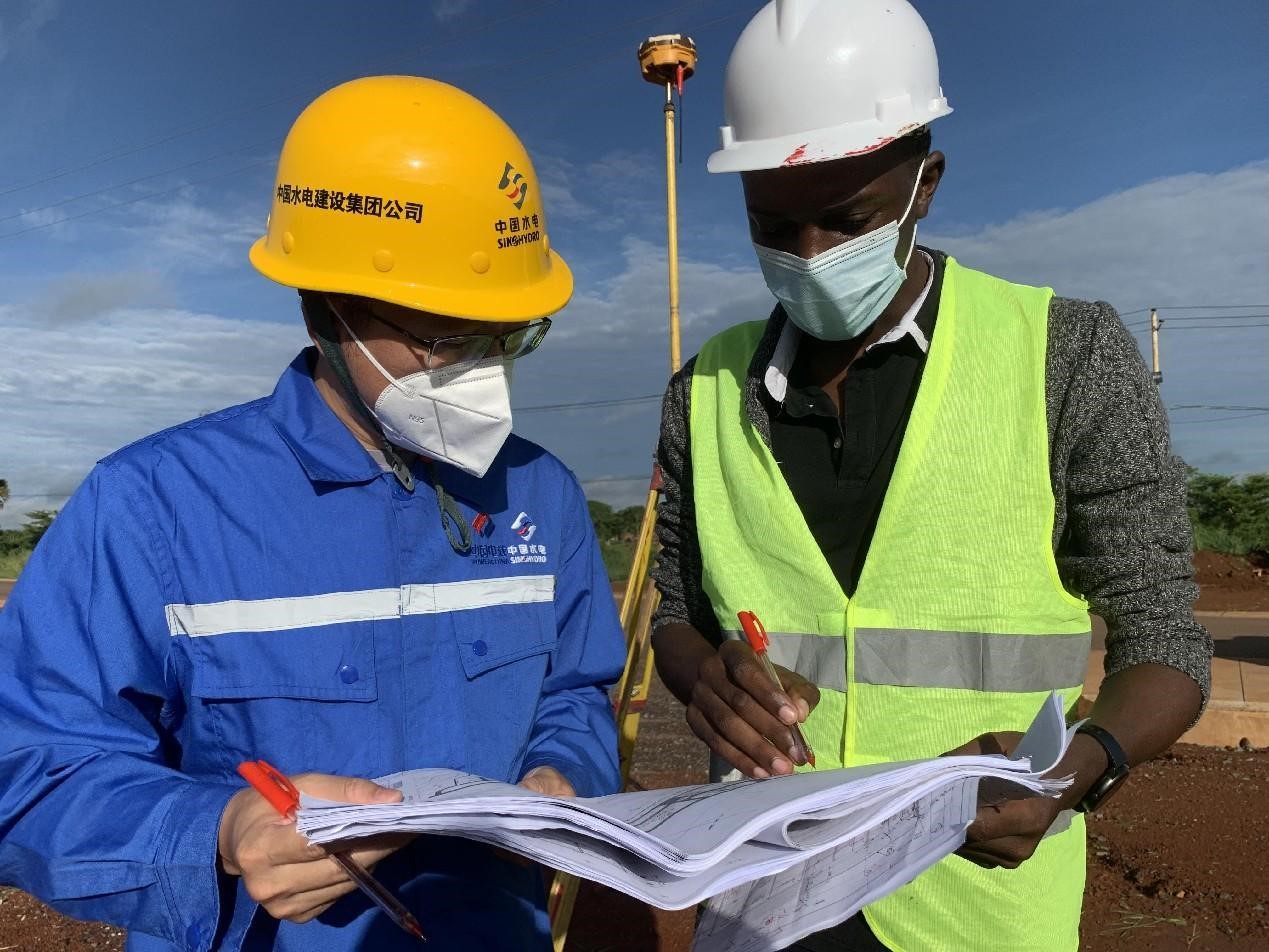 Chinese and Ugandan engineers discuss construction plans at the construction site of the Karuma Hydro Power Plant in Uganda, which is built by Power Construction Corporation of China. (Photo provided by Power Construction Corporation of China)