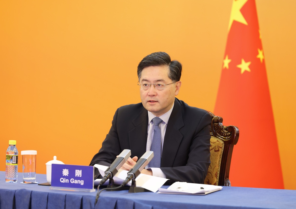 Foreign Minister Qin Gang participates in the opening of the 14th "Love Knows No Borders" international charity sale via video link in Beijing on Jan 17, 2023. [Photo by Feng Yongbin/chinadaily.com.cn]