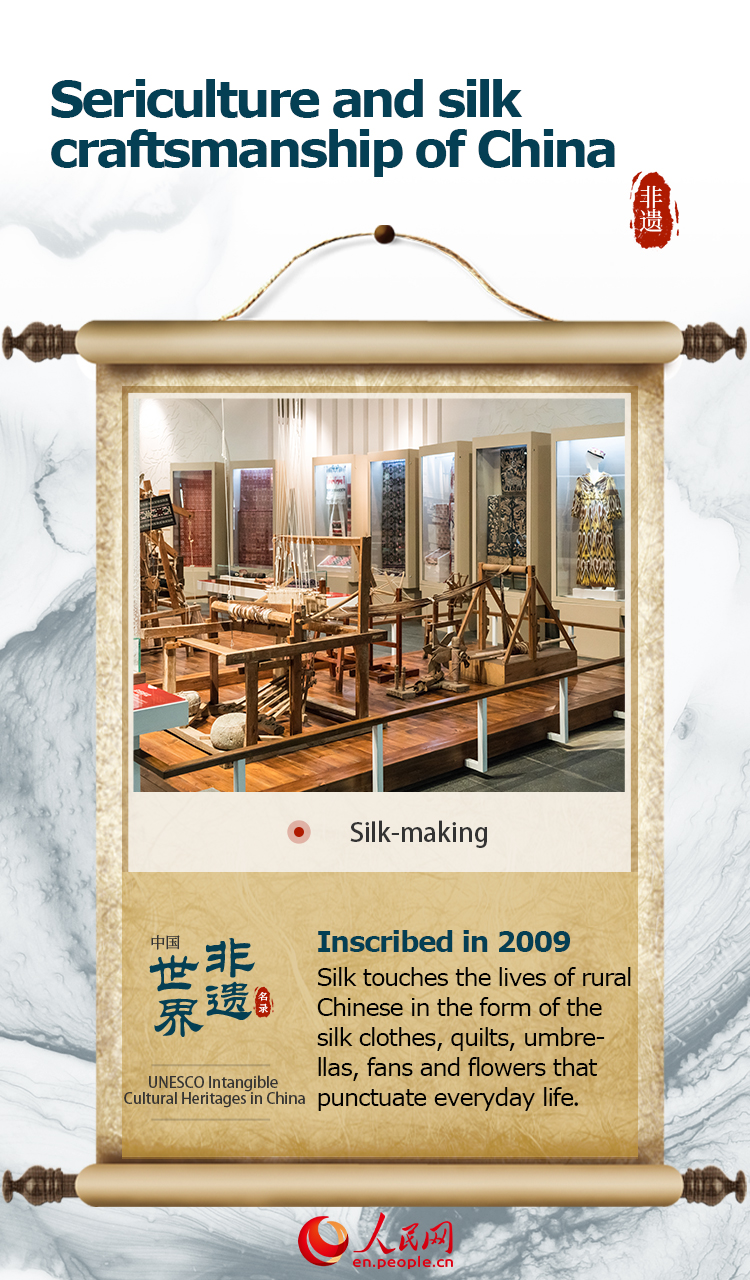 The item “Sericulture and silk craftsmanship of China” was inscribed on UNESCO's Representative List of the Intangible Cultural Heritage of Humanity in 2009.
