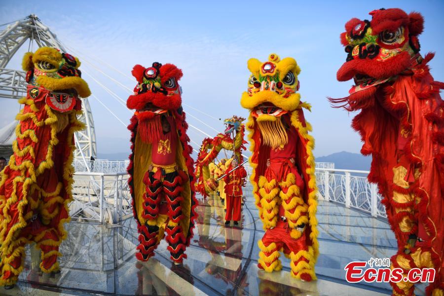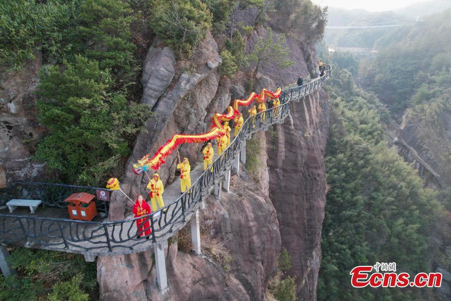 Villagers perform dragon dance on a glass viewing platform to greet the upcoming Spring Festival at Shiniuzhai National Geological Park, central China’s Hunan Province, Jan. 17,, 2023. (Photo: China News Service/Yang Huafeng)