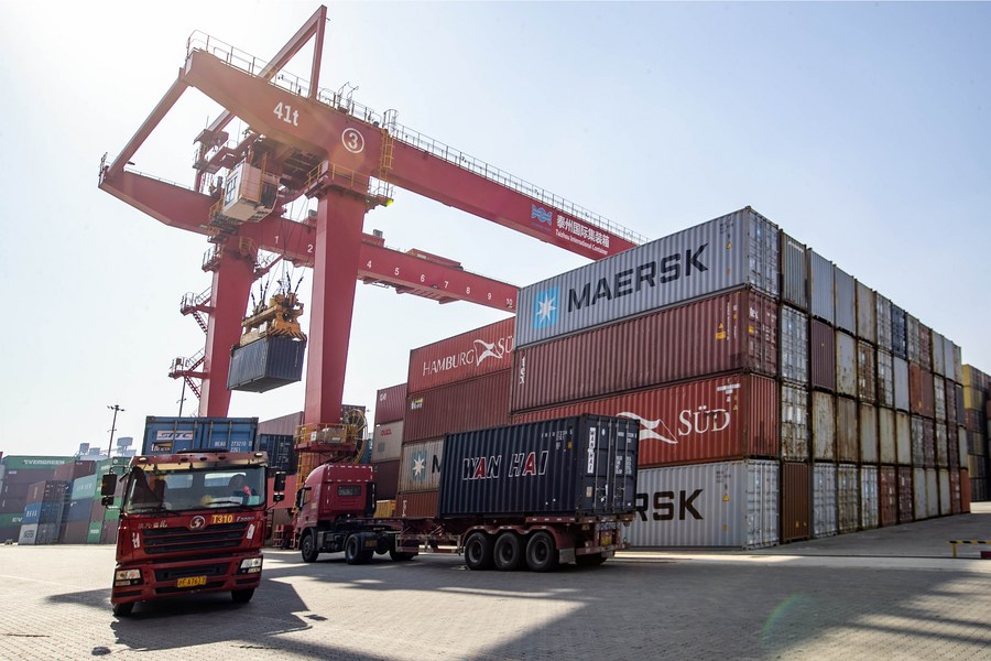 Trucks transport containers at the international container terminal of Taizhou Port in Taizhou, east China's Jiangsu Province, Jan. 17, 2023. (Photo by Tang Dehong/Xinhua)