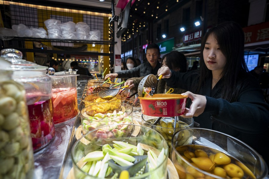 Residents select snacks in the Nanqiang Street of Kunming, southwest China's Yunnan Province, Jan. 11, 2023. (Xinhua/Chen Xinbo)