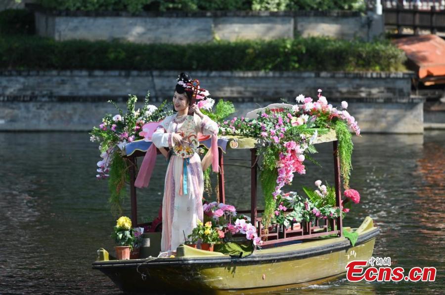 A young woman dressed in traditional Hanfu costume takes part in a cruise parade during the 13th water flower market, a unique tradition during China's Spring Festival in Liwan district of Guangzhou, south China's Guangdong Province, Jan. 18, 2023. (Photo: China News Service/Chen Chuhong)