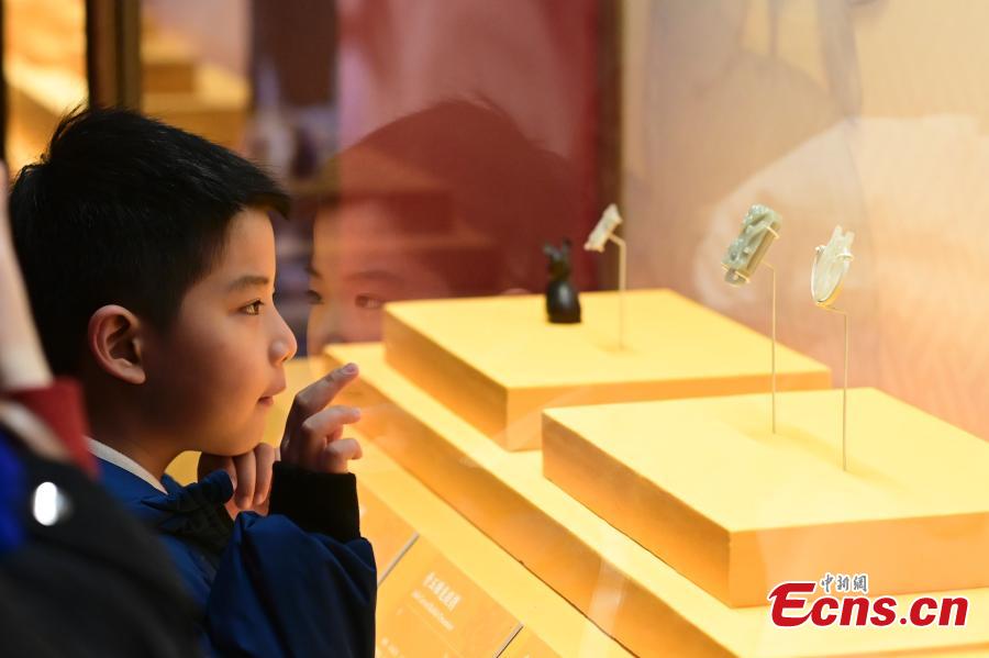 A child views jade rabbits during a themed exhibition at the National Museum of China in Beijing, Jan. 18, 2023. (Photo: China News Service/Tian Yuhao)