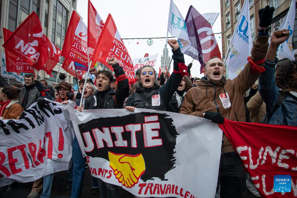 Demonstrators take part in a rally against the government's pension reform plan in Lille, France, on Jan. 19, 2023. France's Ministry of the Interior said that an estimated 1.12 million French people took to the streets across the country on Thursday to protest against the government's controversial pension reform plan. (Photo by Sebastien Courdji/Xinhua)