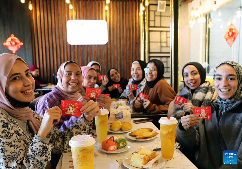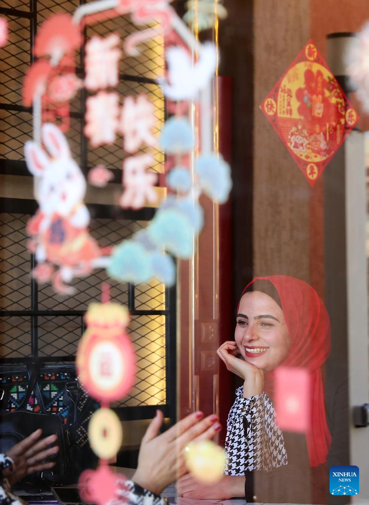 People gather at a bakery which is decorated for the upcoming Chinese Lunar New Year, the year of the Rabbit, in Cairo, Egypt, Jan. 18, 2023. (Xinhua/Wang Dongzhen)
