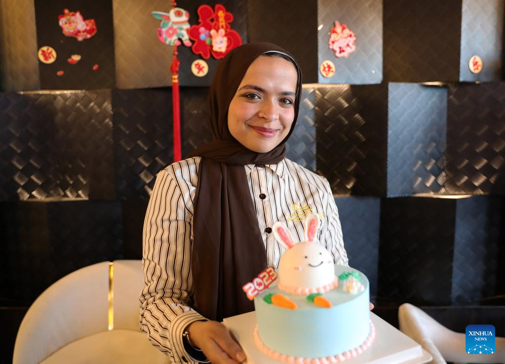 A staff member shows a rabbit-themed cake in celebration of the upcoming Chinese Lunar New Year, the year of the Rabbit, at a bakery in Cairo, Egypt, Jan. 18, 2023. (Xinhua/Wang Dongzhen)