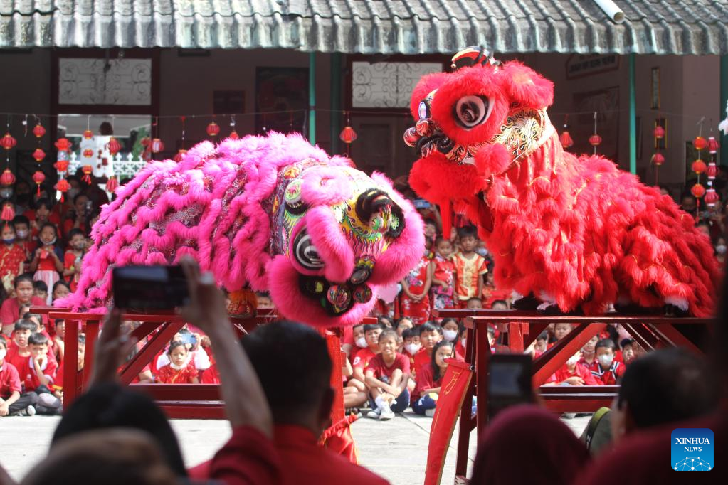 Elementary students watch a lion dance performance during a cultural event to welcome the Chinese Lunar New Year in Surakarta, Central Java, Indonesia, Jan. 19, 2023. (Photo by Bram Selo/Xinhua)