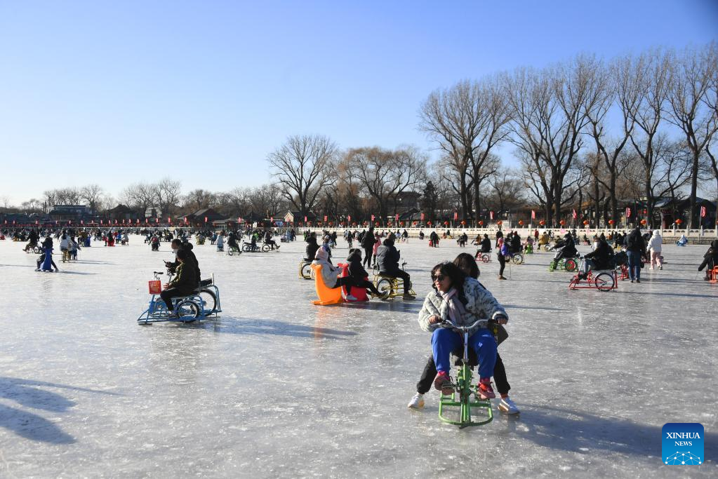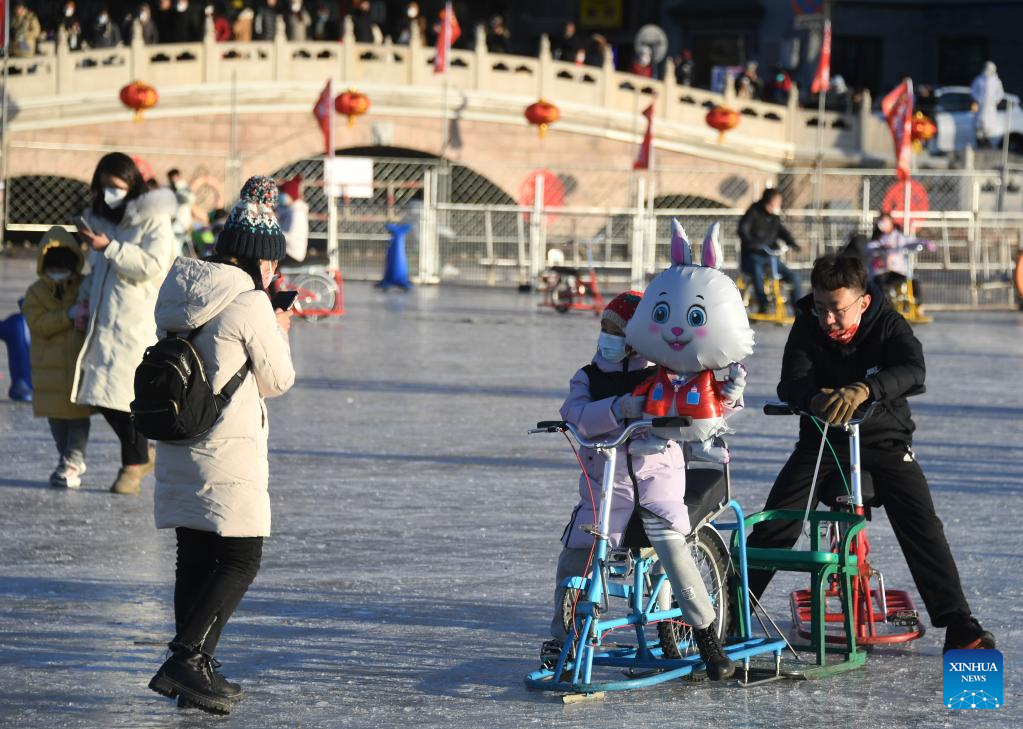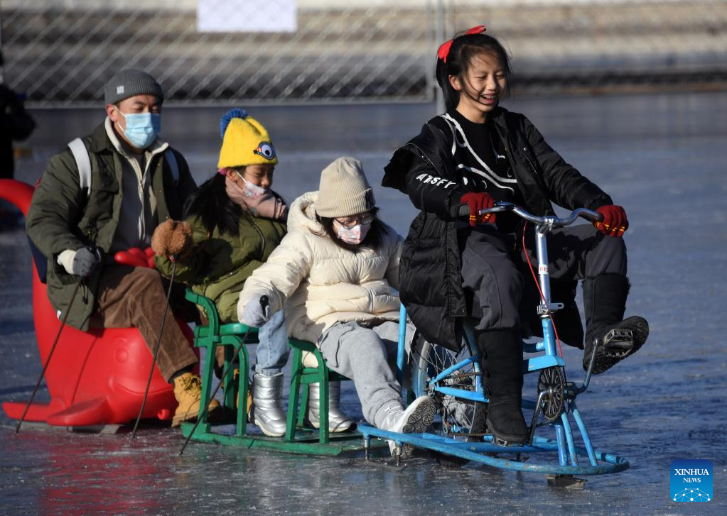 People play on a seasonal outdoor ice rink on the frozen Shichahai lake in Beijing, capital of China, Jan. 20, 2023. (Xinhua/Ren Chao)