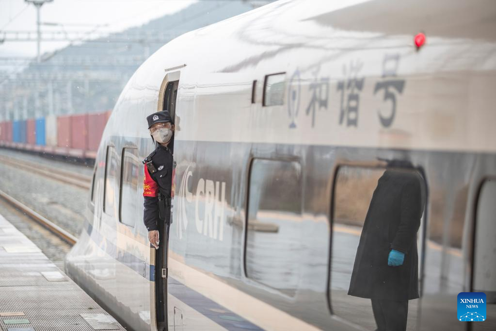 Zhu Xiaoli, a member of the "Fanghua" female railway police officer unit, patrols aboard train No.D1703 which travels from Guiyang North Railway Station to Xi'an North Railway Station, on Jan. 16, 2023.