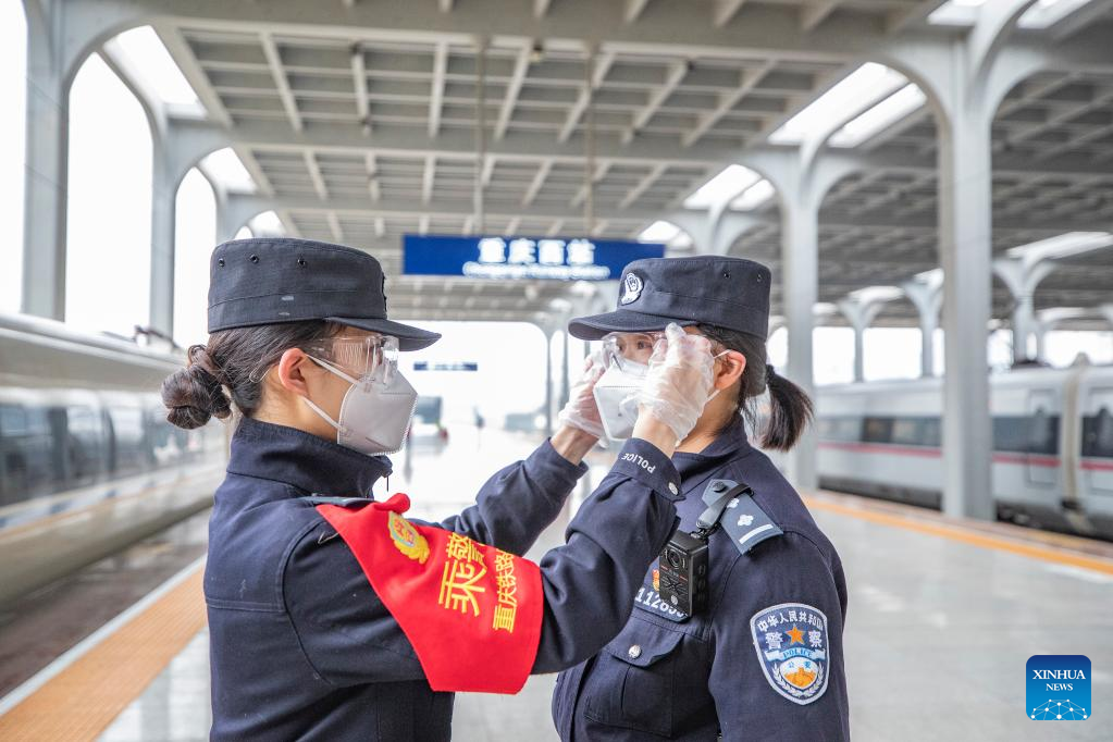 Tan Lin (L) and Bao Jie, members of the "Fanghua" female railway police officer unit, prepare for work in Chongqing, southwest China, Jan. 18, 2023.