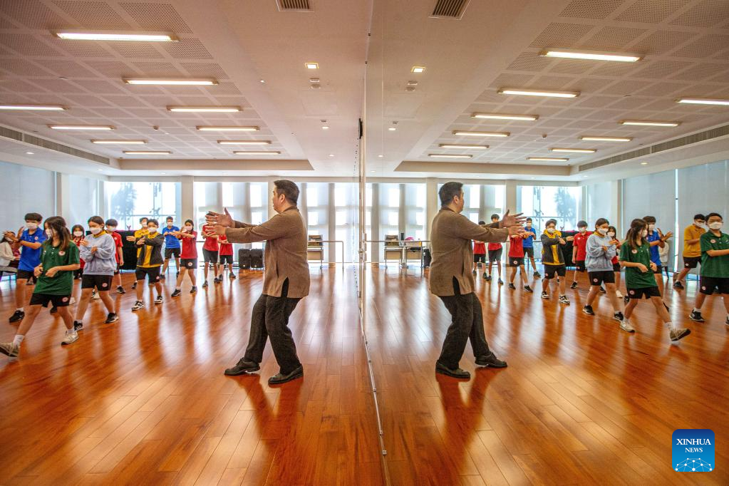 Ekarat Janrathitikarn (C), Thai dean of the Maritime Silk Road Confucius Institute, teaches Chinese Tai Chi to Thai students at China Culture Center in Bangkok, Thailand, Jan. 20, 2023. More than 300 Thai teachers and students came to experience traditional Chinese culture at an event jointly held by the China Culture Center in Bangkok and the Maritime Silk Road Confucius Institute ahead of the Chinese Lunar New Year. (Xinhua/Wang Teng)