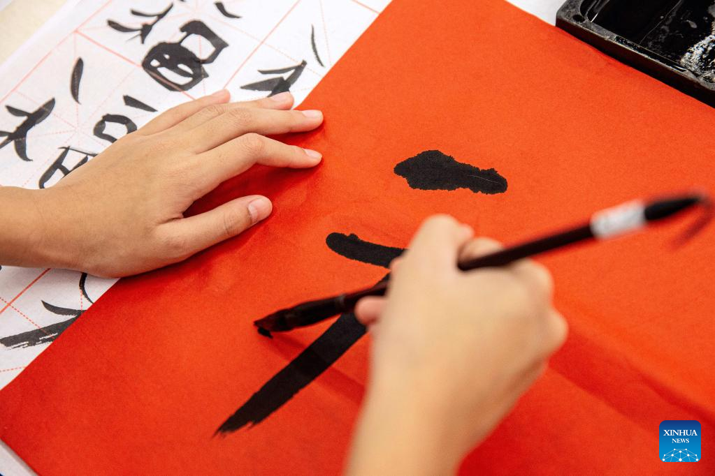 A Thai student practices calligraphy at China Culture Center in Bangkok, Thailand, Jan. 20, 2023. More than 300 Thai teachers and students came to experience traditional Chinese culture at an event jointly held by the China Culture Center in Bangkok and the Maritime Silk Road Confucius Institute ahead of the Chinese Lunar New Year. (Xinhua/Wang Teng)