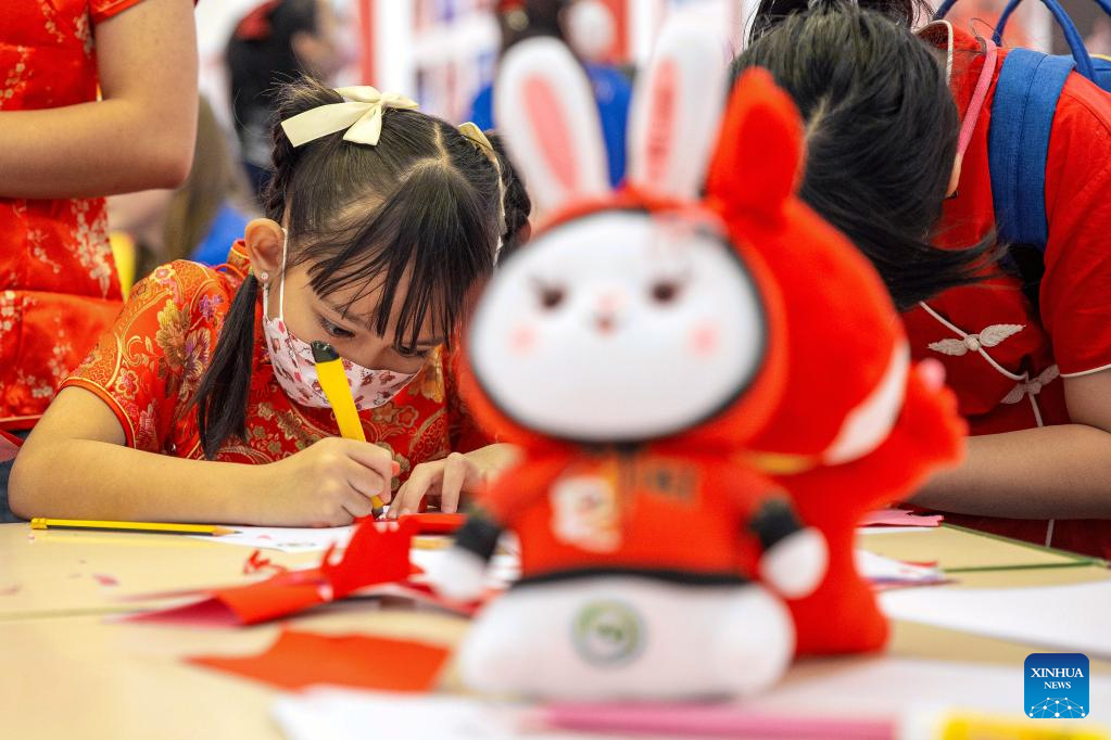Thai students practice paper-cutting at China Culture Center in Bangkok, Thailand, Jan. 20, 2023. More than 300 Thai teachers and students came to experience traditional Chinese culture at an event jointly held by the China Culture Center in Bangkok and the Maritime Silk Road Confucius Institute ahead of the Chinese Lunar New Year. (Xinhua/Wang Teng)