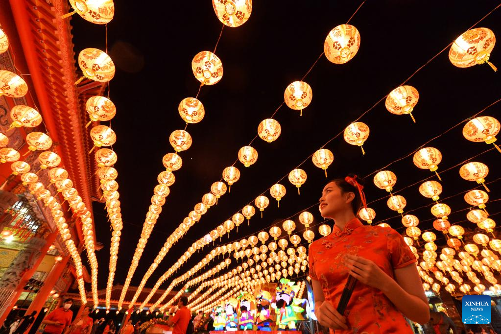 People visit a lantern festival in Samut Prakan, Thailand, Jan. 20, 2023. The event is held here from Jan. 20 to Feb. 19. (Xinhua/Rachen Sageamsak)