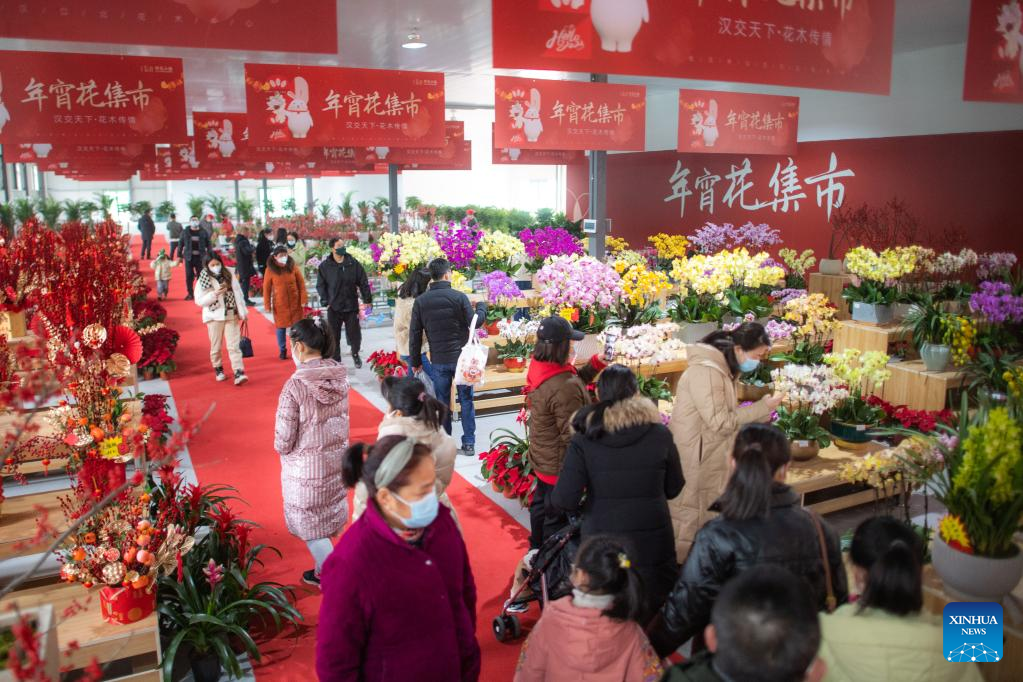 This photo taken on Jan. 1, 2023 shows people selecting flowers at the "flower town" of Wuhan Hankoubei International Commodity Trade Center in Wuhan, central China's Hubei Province. (Xinhua/Xiao Yijiu)