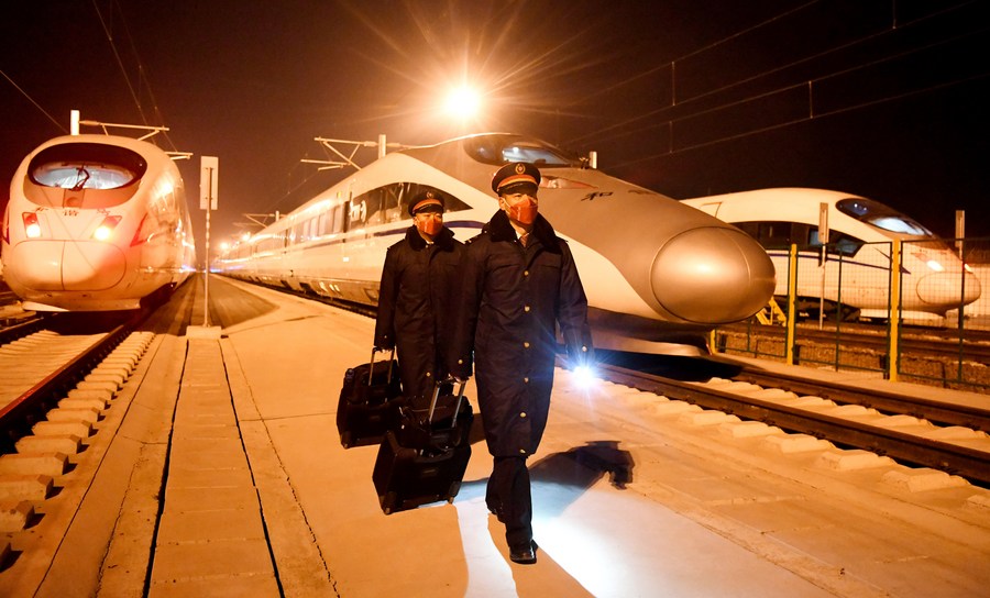 Bullet train drivers prepare to work in Luoyang, central China's Henan Province, Jan. 21, 2023. People from various sectors stick to their posts on the eve of the Chinese Lunar New Year, or Spring Festival, which falls on Jan. 22. (Photo by Zhang Yixi/Xinhua)