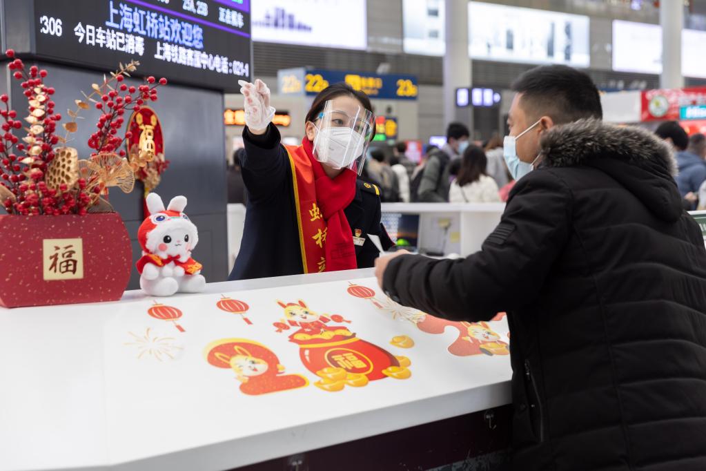 A staff member guides a passenger at Shanghai Hongqiao Railway Station in east China's Shanghai, Jan. 21, 2023.