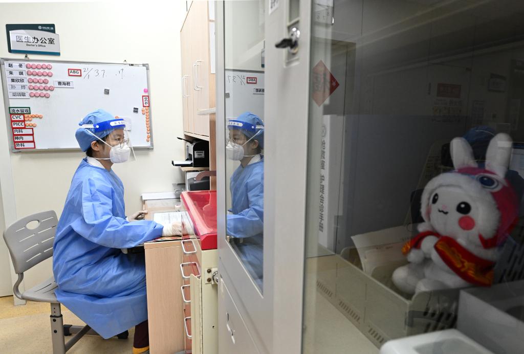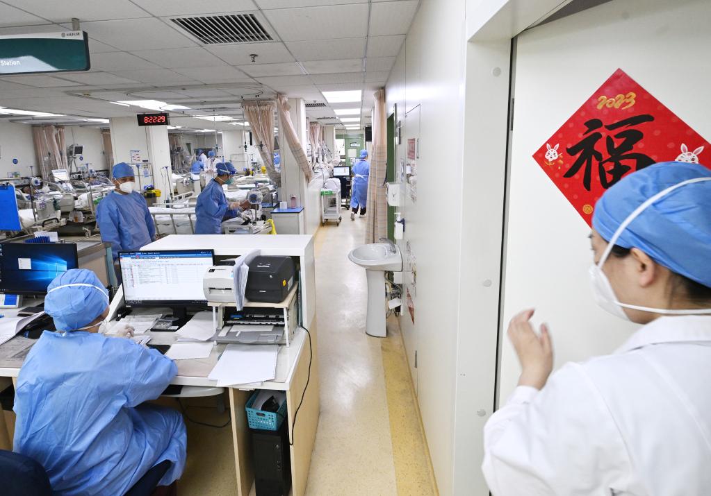 Li Xiaojing, deputy director of the emergency department in Peking University First Hospital, checks on a patient with severe illness at the hospital in Beijing, capital of China, Jan. 21, 2023. Medical staff of the emergency department in Peking University First Hospital stick to their posts on Chinese Lunar New Year's Eve or "Chuxi" in Chinese. "Chuxi", which falls on Jan. 21 this year, is one of the most important days for family reunion in China. (Xinhua/Li He)