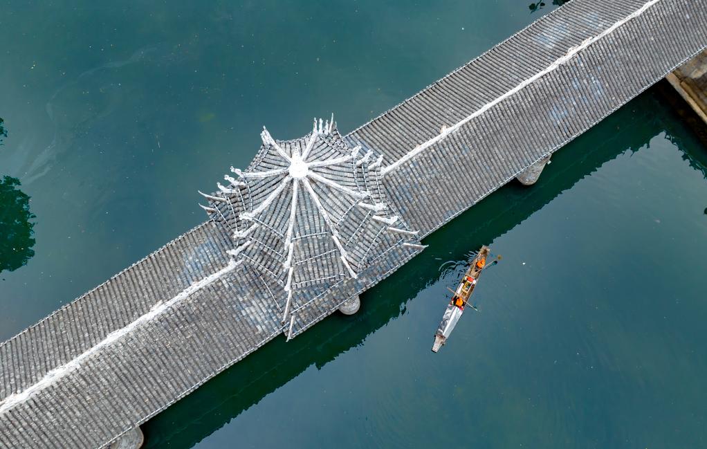 This aerial photo taken on Jan. 21, 2023 shows sanitation workers collecting floating objects on a river in Shuangjiang Township of Tongdao Dong Autonomous County, central China's Hunan Province.