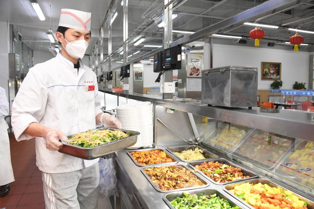 A staff member prepares dishes for students at a canteen of Beijing Jiaotong University in Beijing, capital of China, Jan. 21, 2023.