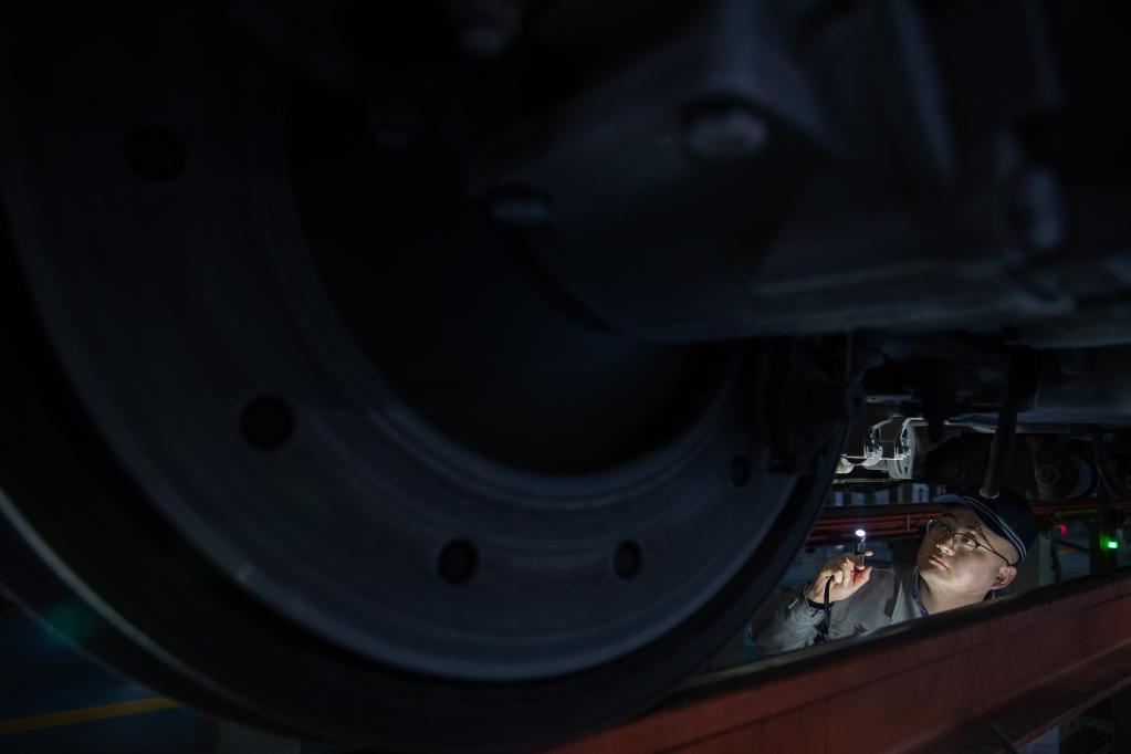 A technician checks the condition of a bullet train at a maintenance base in Harbin, northeast China's Heilongjiang Province, Jan. 21, 2023.