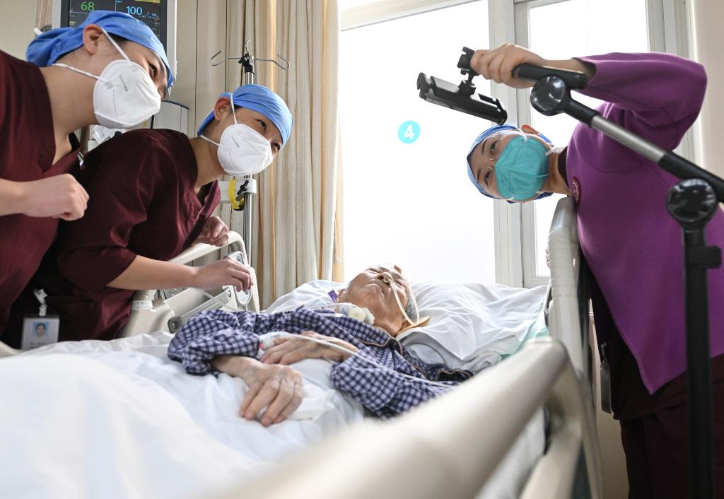 Nurse Wu Fan (1st R) helps family members of an aged patient checking on the patient through a video call at the intensive care unit of Peking University First Hospital in Beijing, capital of China, Jan. 21, 2023. Medical staff of the emergency department in Peking University First Hospital stick to their posts on Chinese Lunar New Year's Eve or "Chuxi" in Chinese. "Chuxi", which falls on Jan. 21 this year, is one of the most important days for family reunion in China. (Xinhua/Li He)