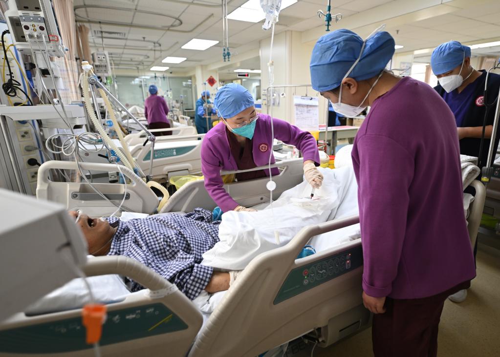 Nurses conduct sputum suction for an aged patient with severe illness at the emergency room of Peking University First Hospital in Beijing, capital of China, Jan. 21, 2023. Medical staff of the emergency department in Peking University First Hospital stick to their posts on Chinese Lunar New Year's Eve or "Chuxi" in Chinese. "Chuxi", which falls on Jan. 21 this year, is one of the most important days for family reunion in China. (Xinhua/Li He)
