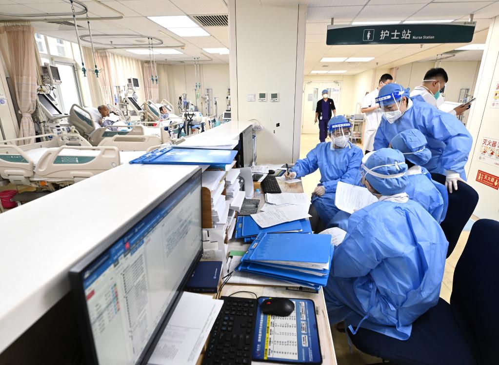 Doctors discuss on patients' conditions at the intensive care unit of Peking University First Hospital in Beijing, capital of China, Jan. 21, 2023. Medical staff of the emergency department in Peking University First Hospital stick to their posts on Chinese Lunar New Year's Eve or "Chuxi" in Chinese. "Chuxi", which falls on Jan. 21 this year, is one of the most important days for family reunion in China. (Xinhua/Li He)