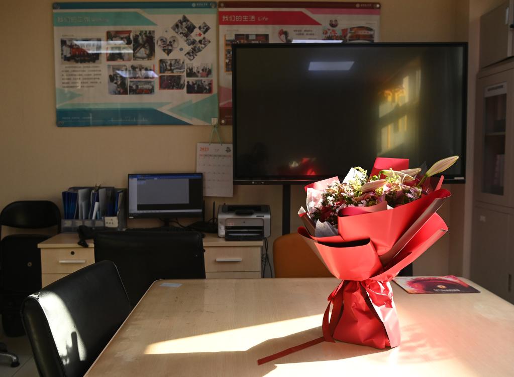A bouquet sent from Peking University Health Science Center is seen at the meeting room of the emergency department in Peking University First Hospital in Beijing, capital of China, Jan. 21, 2023. Medical staff of the emergency department in Peking University First Hospital stick to their posts on Chinese Lunar New Year's Eve or "Chuxi" in Chinese. "Chuxi", which falls on Jan. 21 this year, is one of the most important days for family reunion in China. (Xinhua/Li He)