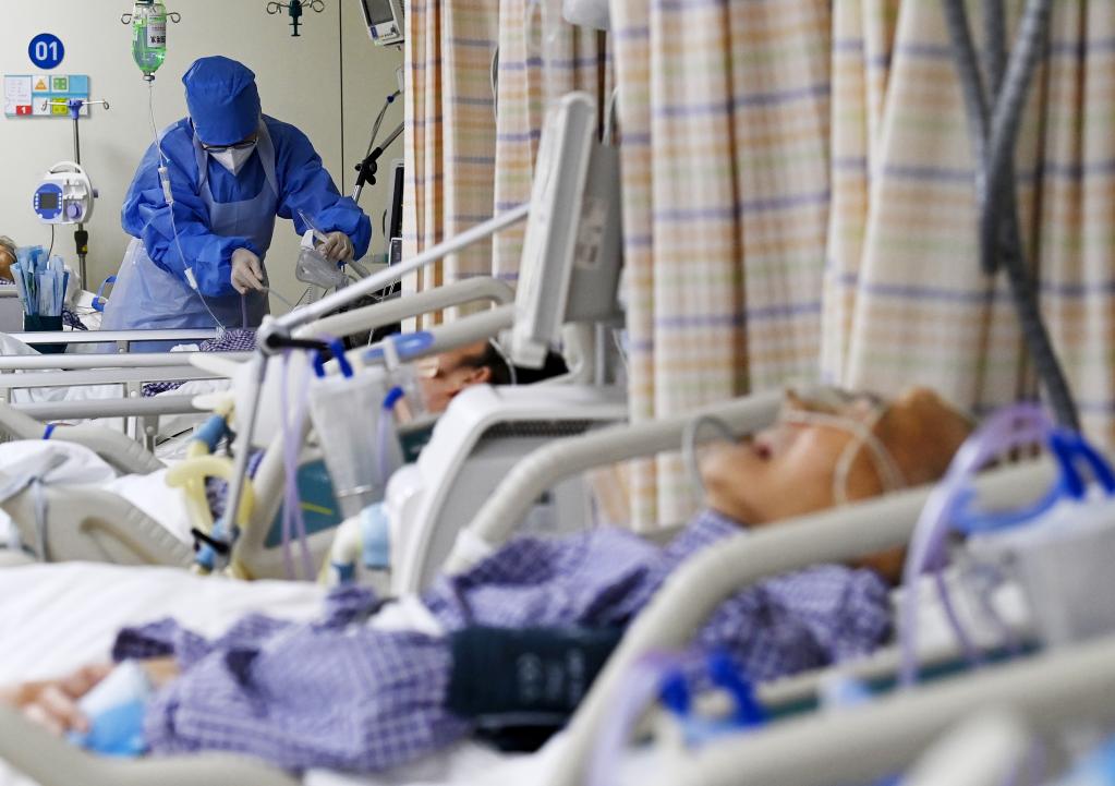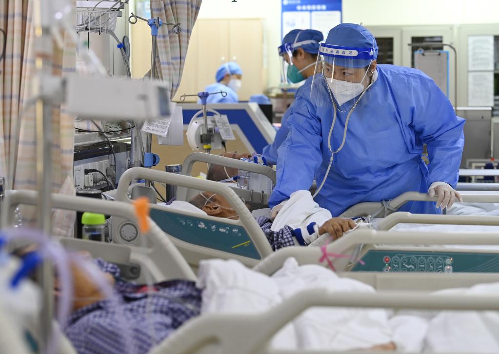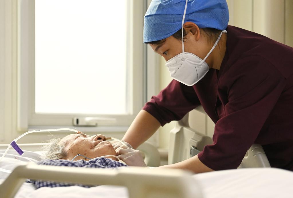 Nurse Chen Rukun takes care of an aged patient with severe illness at the intensive care unit of Peking University First Hospital in Beijing, capital of China, Jan. 21, 2023. Medical staff of the emergency department in Peking University First Hospital stick to their posts on Chinese Lunar New Year's Eve or "Chuxi" in Chinese. "Chuxi", which falls on Jan. 21 this year, is one of the most important days for family reunion in China. (Xinhua/Li He)
