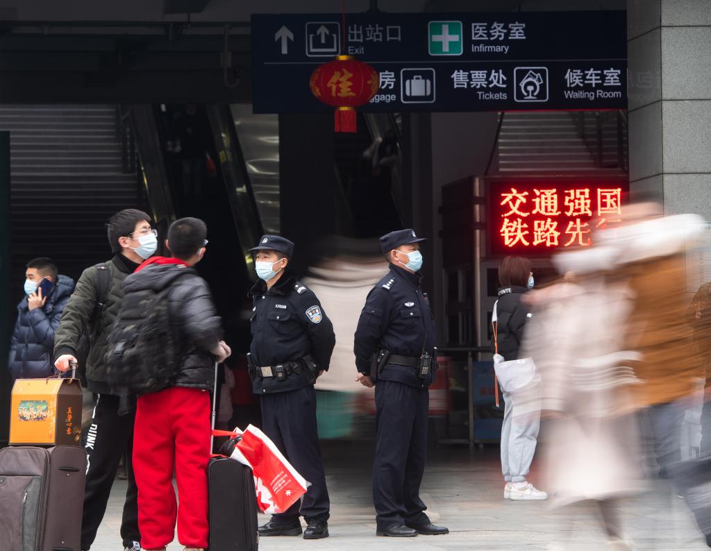 Police officers are on duty at Yichang East Railway Station in Yichang, central China's Hubei Province, Jan. 21, 2023.