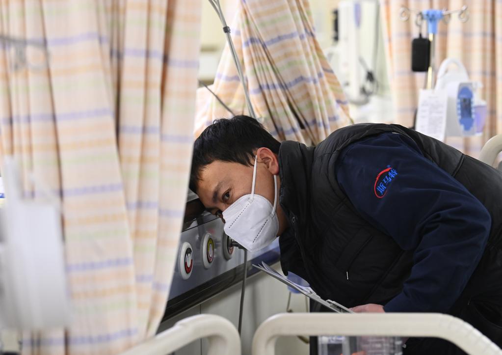 Nurses prepare a patient for hemodialysis treatment at the intensive care unit of Peking University First Hospital in Beijing, capital of China, Jan. 21, 2023. Medical staff of the emergency department in Peking University First Hospital stick to their posts on Chinese Lunar New Year's Eve or "Chuxi" in Chinese. "Chuxi", which falls on Jan. 21 this year, is one of the most important days for family reunion in China. (Xinhua/Li He)