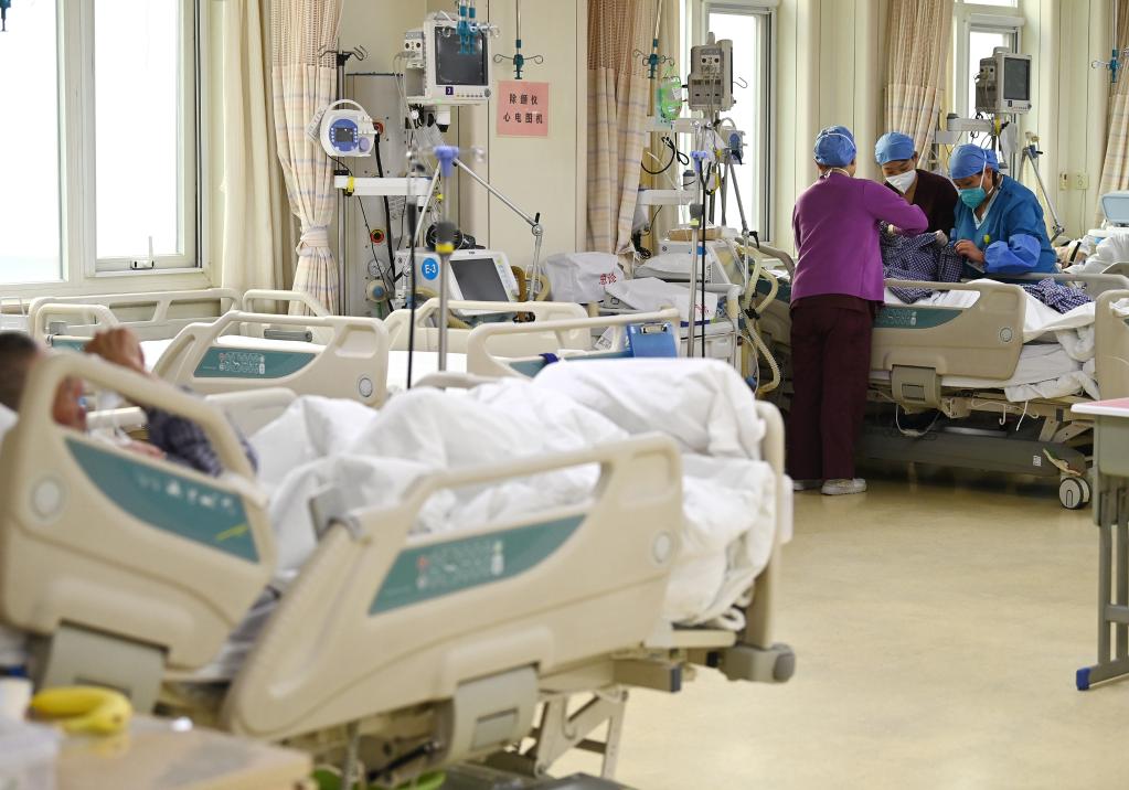 Nursing personnel change clothes for a patient with severe illness at the intensive care unit of Peking University First Hospital in Beijing, capital of China, Jan. 21, 2023. Medical staff of the emergency department in Peking University First Hospital stick to their posts on Chinese Lunar New Year's Eve or "Chuxi" in Chinese. "Chuxi", which falls on Jan. 21 this year, is one of the most important days for family reunion in China. (Xinhua/Li He)