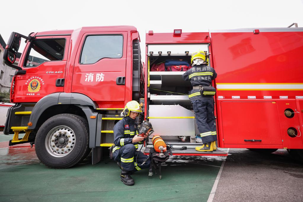 Firefighters arrange fire-fighting equipment at a fire station of Danzhai County, southwest China's Guizhou Province, Jan. 21, 2023.
