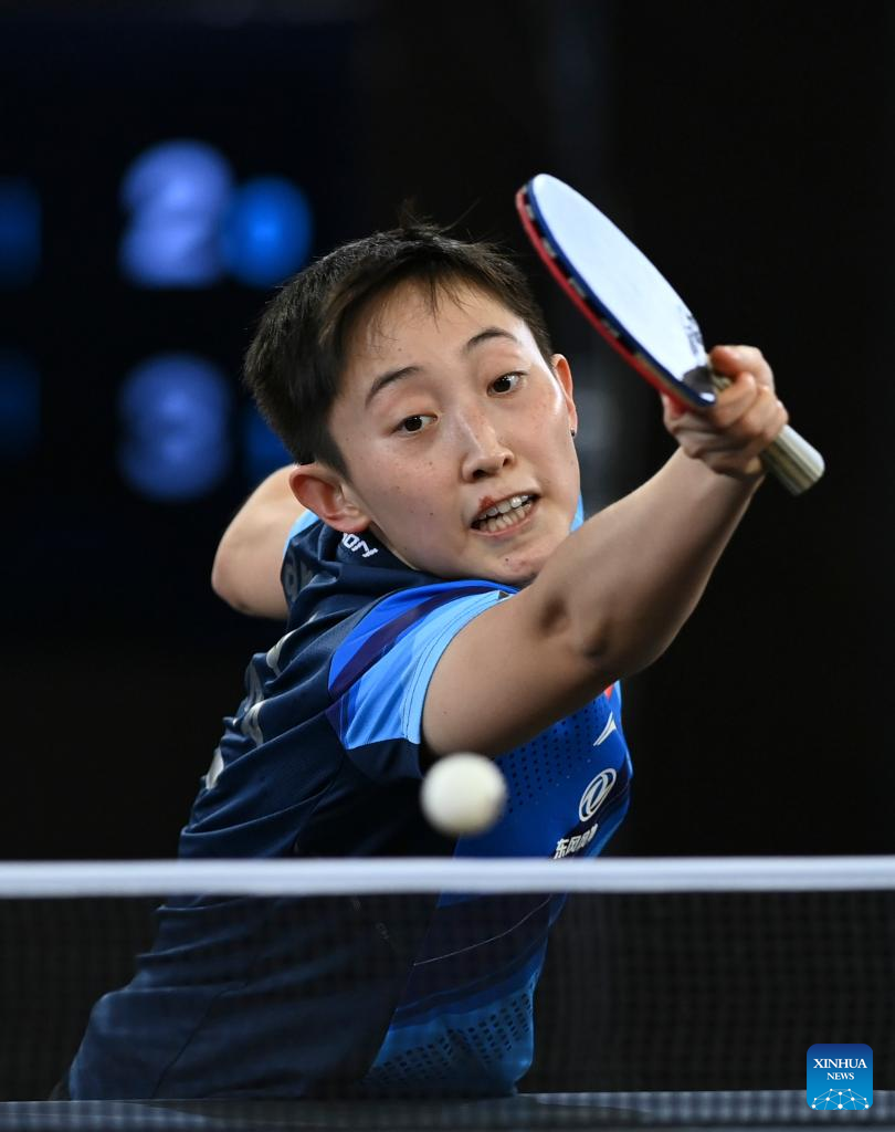 (230121) -- DOHA, Jan. 21, 2023 (Xinhua) -- Fan Siqi hits a return during the women's singles final match between Fang Siqi of China and her teammate Zhang Rui at WTT Contender Doha 2023 table tennis tournament in Doha, Qatar, on Jan. 21, 2023. (Photo by Nikku/Xinhua)