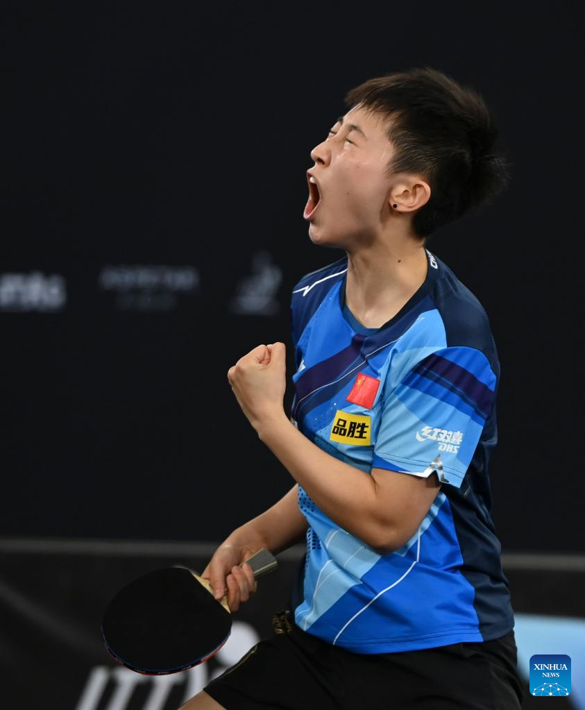 (230121) -- DOHA, Jan. 21, 2023 (Xinhua) -- Fan Siqi celebrates scoring during the women's singles final match between Fang Siqi of China and her teammate Zhang Rui at WTT Contender Doha 2023 table tennis tournament in Doha, Qatar, on Jan. 21, 2023. (Photo by Nikku/Xinhua)