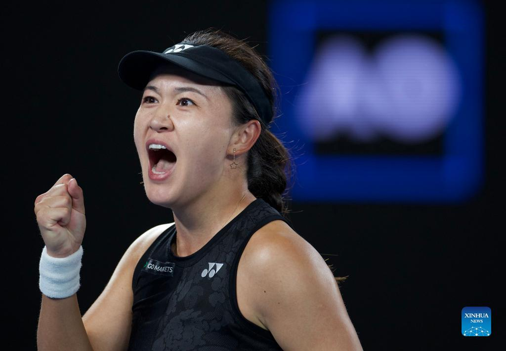 Zhu Lin of China celebrates during the women's singles 4th round match against Victoria Azarenka of Belarus at Australian Open in Melbourne Park in Melbourne, Australia, Jan. 22, 2023. (Photo by Hu Jingchen/Xinhua)