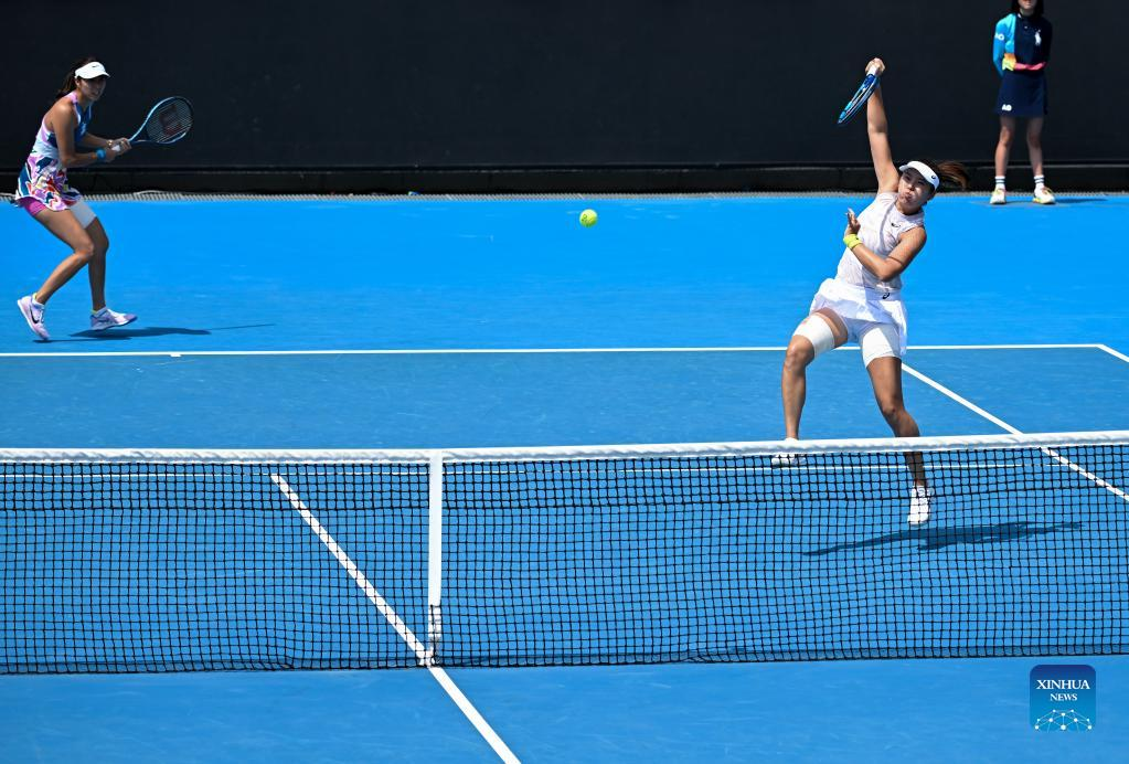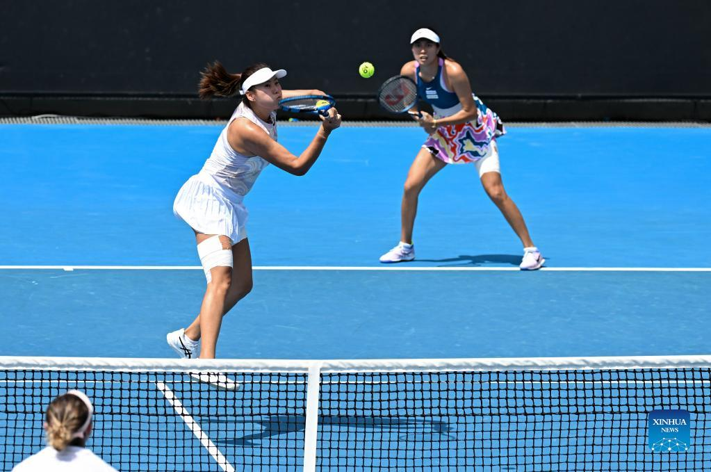 Yang Zhaoxuan (top L)/Chan Hao-Ching compete during the women's doubles 2nd round match between Yang Zhaoxuan (China)/Chan Hao-Ching (Chinese Taipei) and Cristina Bucsa (Spain)/Ninomiya Makoto (Japan) at Australian Open in Melbourne Park, in Melbourne, Australia, on Jan. 22, 2023. (Xinhua/Guo Lei)