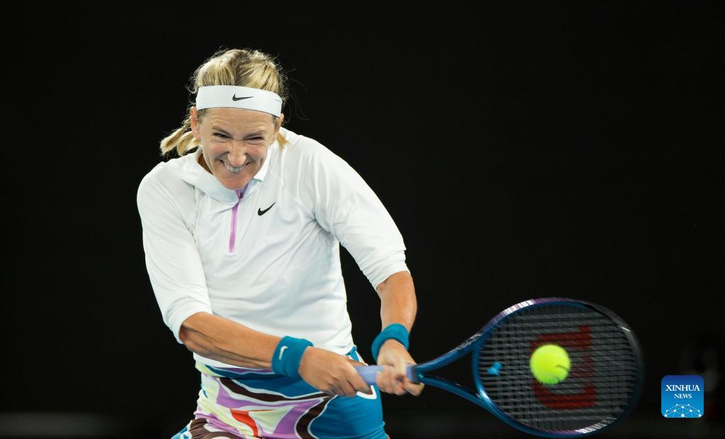Victoria Azarenka of Belarus returns a shot during the women's singles 4th round match against Zhu Lin of China at Australian Open in Melbourne Park in Melbourne, Australia, Jan. 22, 2023. (Photo by Hu Jingchen/Xinhua)