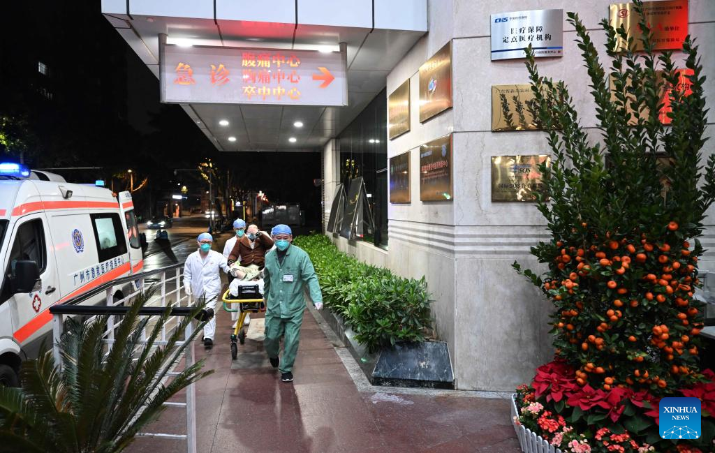 Medical staff transfer a patient at Guangdong Provincial Hospital of Chinese Medicine in Guangzhou, south China's Guangdong Province, Jan. 21, 2023. Medical staff stick to their posts during the Spring Festival holiday. (Xinhua/Deng Hua)