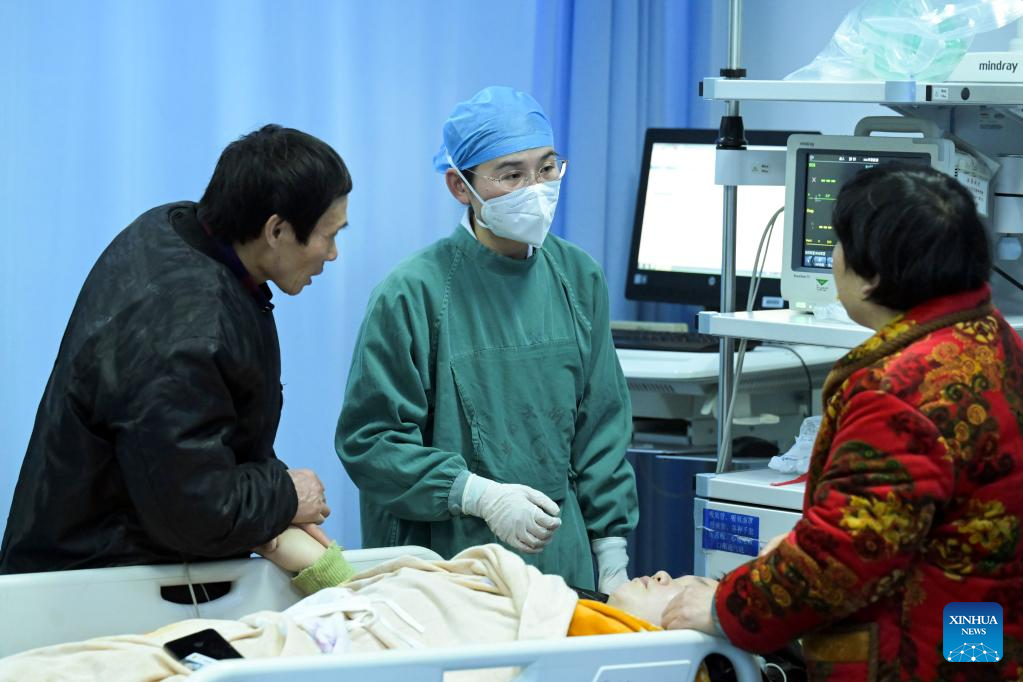 A medical worker checks the condition of a patient at the emergency department of the Second Affiliated Hospital of Anhui Medical University in Hefei, east China's Anhui Province, Jan. 21, 2023. Medical staff stick to their posts during the Spring Festival holiday. (Xinhua/Zhou Mu)