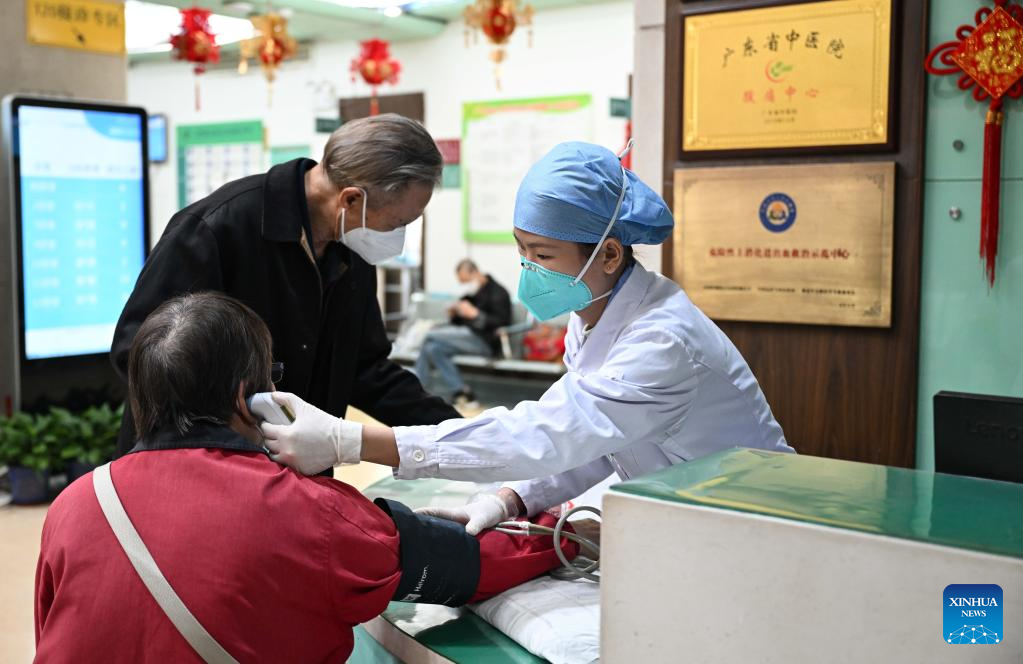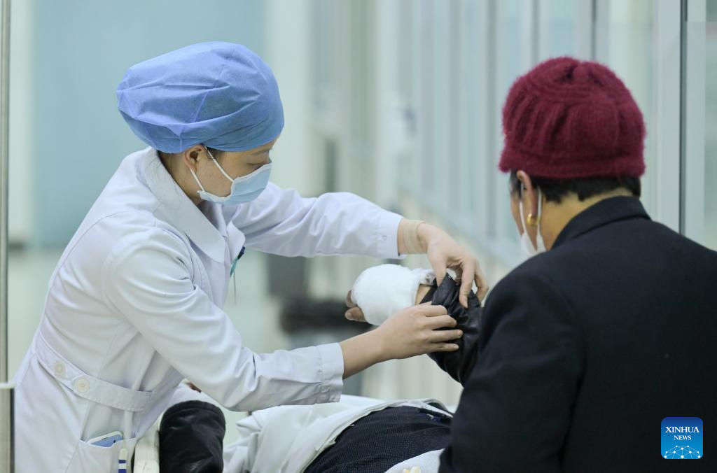A medical worker checks the condition of a patient at the emergency department of Guangdong Provincial Hospital of Chinese Medicine in Guangzhou, south China's Guangdong Province, Jan. 21, 2023. Medical staff stick to their posts during the Spring Festival holiday. (Xinhua/Deng Hua)
